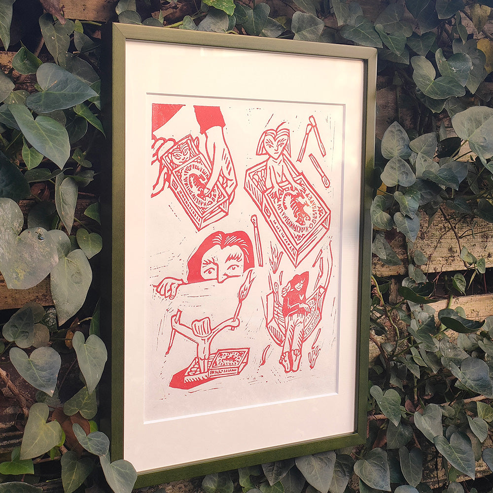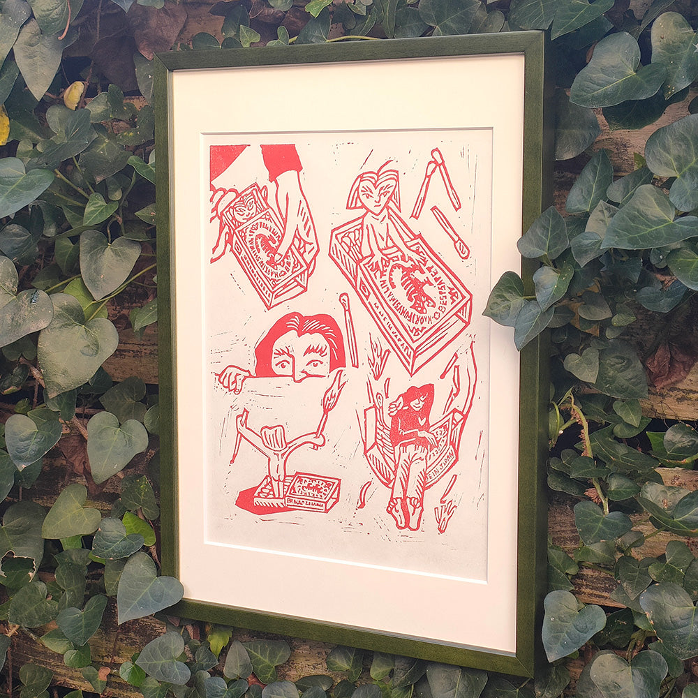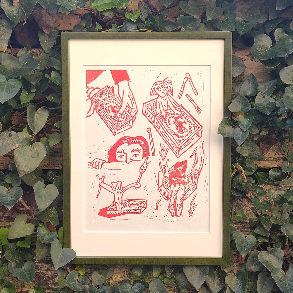 Work description: A boy is bored and doesn't feel like doing anything, so he takes out an old matchbox from his desk drawer. The moment he opens it to smoke a cigarette, a little fairy appears from inside the box. The fairy looks angry at being suddenly woken up from his peaceful sleep. "Don't wake me up without my permission!" he says, as he quickly lights the match. At that moment, the boy is captivated by the beauty and warmth of the flame that blazes up.