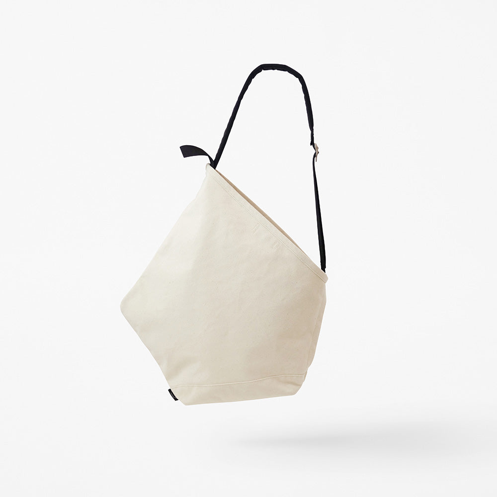 The shape of the bag is a slightly irregular pentagon, which shifts the center of gravity, and the heavier the contents are, the more the handles turn sideways, making it feel like a one-shoulder backpack. If you tilt the bag slightly, the opening turns upwards, so it can be used like a tote. The details and metal fittings of the shoulder strap are as "backpack-like" as possible, and the fabric is deliberately made of "tote-like" canvas, so that the hybrid nature of the two is not only functional but also visually distinctive.