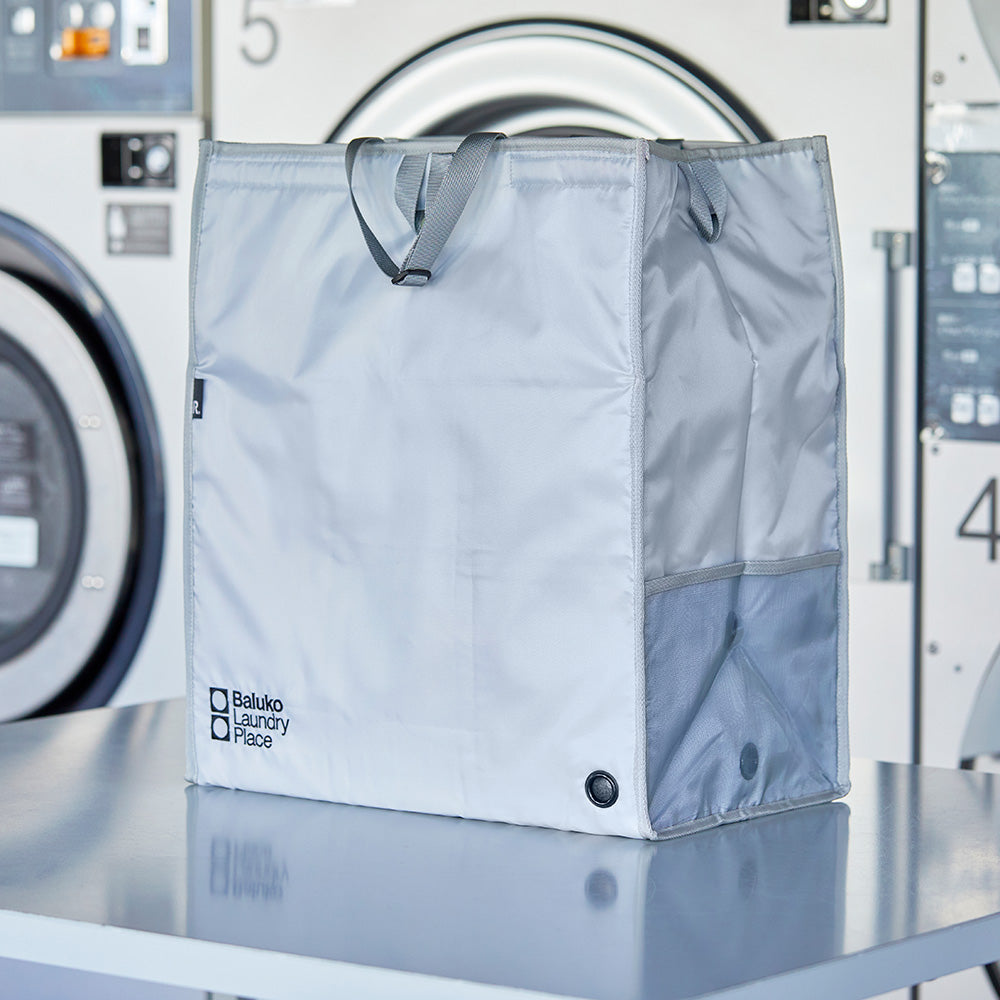 〈コンテナ〉は大容量の自立型トートバッグ。洗濯乾燥機Mサイズ(約70リットル)の適量が入ります。ハリのある生地と四角の支柱により安定した形状を保ち、しっかりと自立します。ご家庭ではランドリーボックスとして使用し、いっぱいになったらそのままランドリーに持ち運ぶことができます。