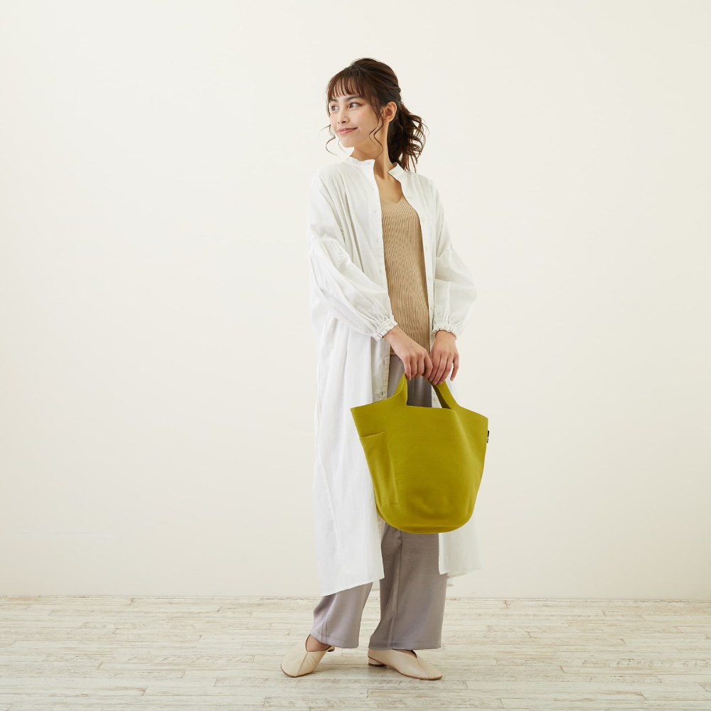 ざっくりとモノを入れて、バスケットの様に使用ができます。側面はカンガルーのおなかのポケットのようなルーポケット付き。ポケット部分は本体と一体で編まれていて、縫い目が無いつくりをしています。